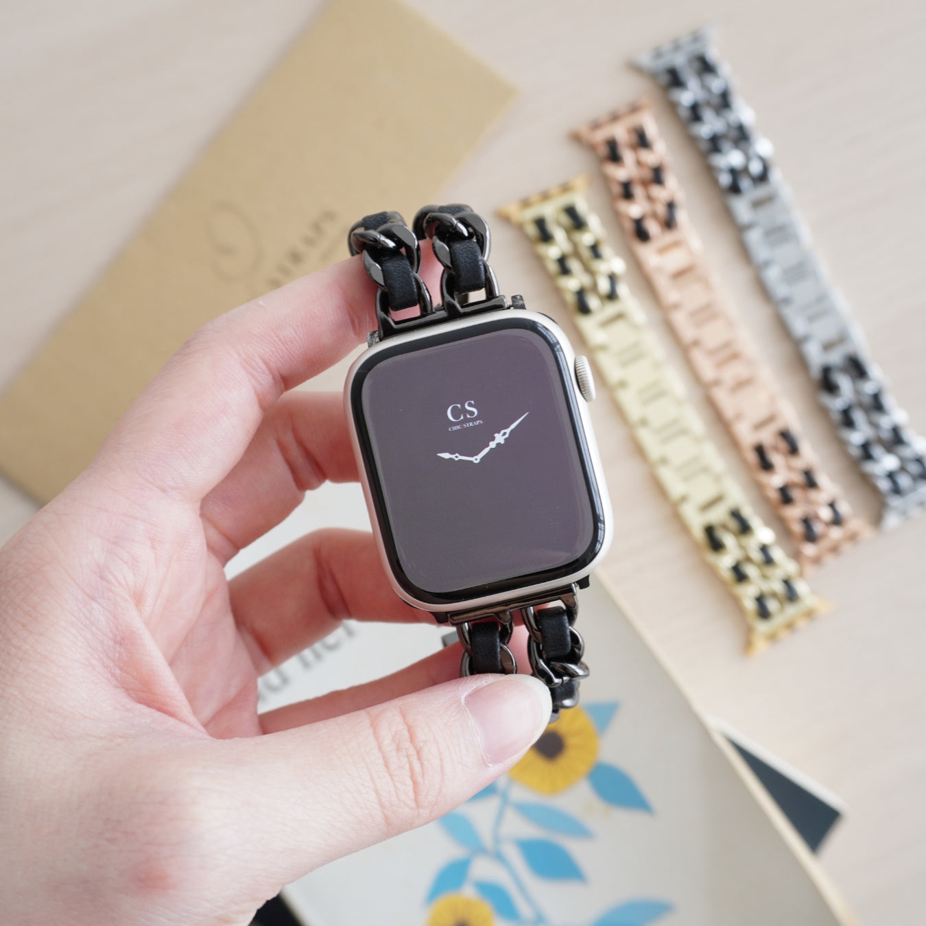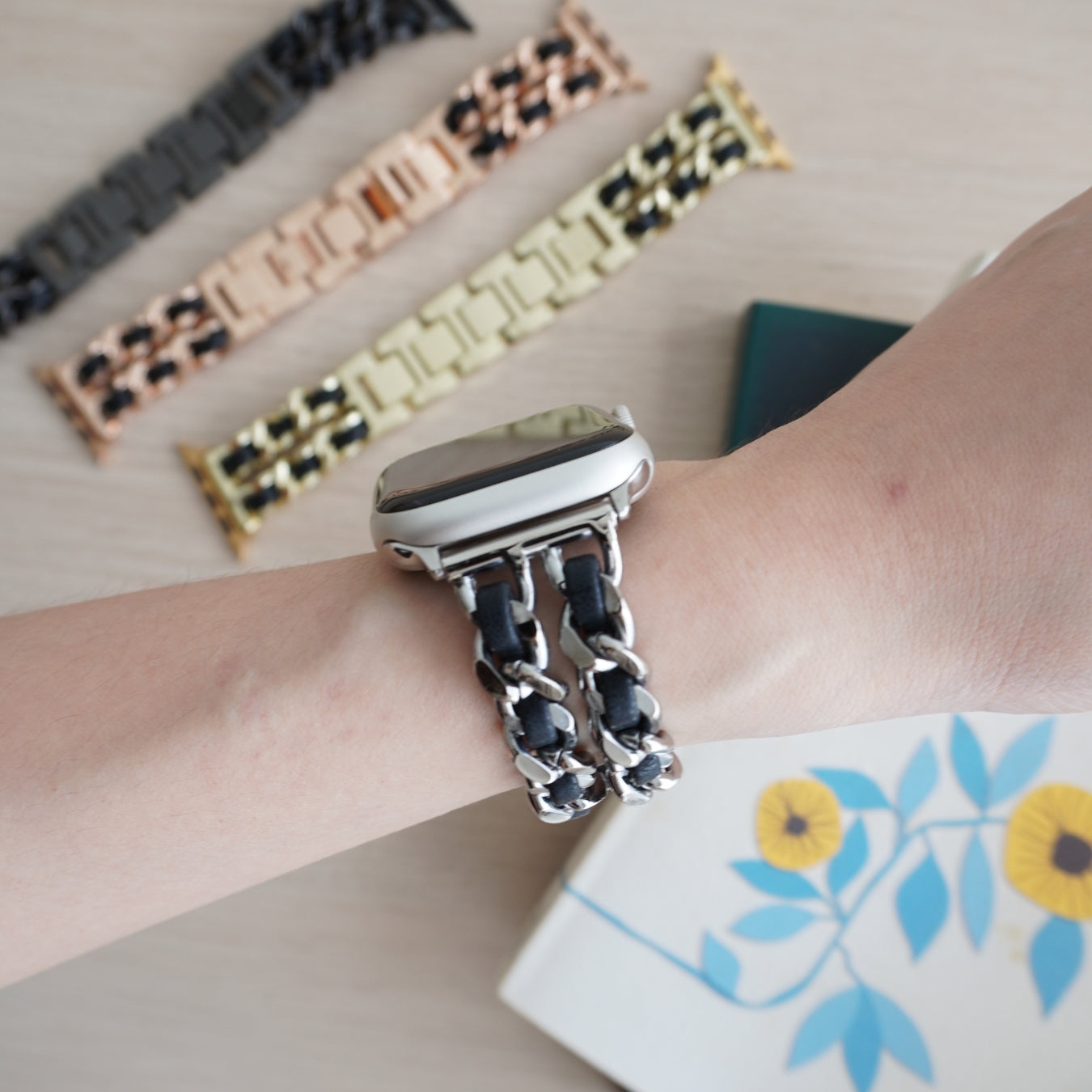 Stunning interwoven beauty of leather juxtaposed against stainless steel links, this metal bracelet boats elegance with a modern twist. Made from high quality stainless steel lugs, its weighty feel will drape boldly around your wrist, all while maintaining an elegant, gentle, tactility in its form.